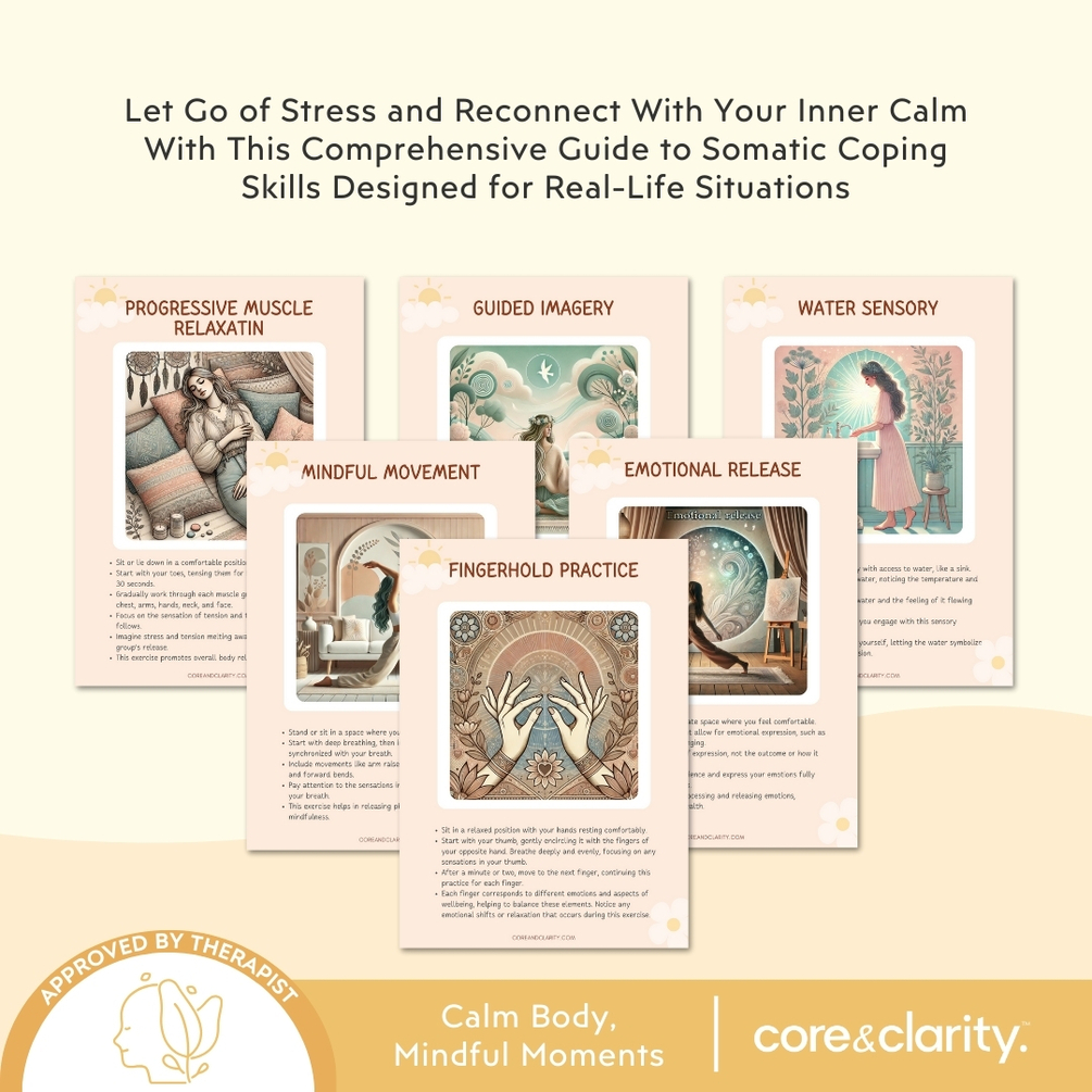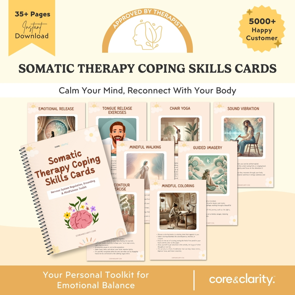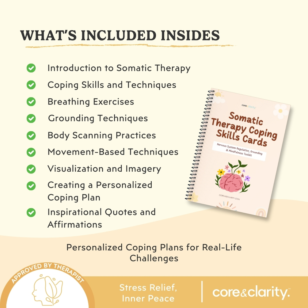 Ease stress with somatic therapy coping cards. Includes grounding techniques, body-based exercises, and relaxation strategies for emotional balance.